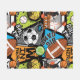 A bold, energetic sports collage featuring basketball, football, soccer, tennis, and baseball elements with dynamic typography like “Big Game,” “Goal Time,” and “Winner,” set in bright, high-contrast colors.