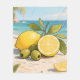 Capture the essence of a Mediterranean seaside escape with this vibrant, cheerful illustration. Juicy yellow lemons — whole and sliced — shine brightly alongside plump green olives on a branch, all nestled on warm sandy shores with turquoise ocean waves and swaying palm trees in the background. The bright, zesty citrus tones pop against soft blues and golds, evoking sunny freshness, coastal relaxation, and invigorating summer vibes perfect for lovers of Mediterranean flair and tropical refreshment.