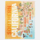 Imagem brilhante e encantadora apresenta um desenho animado do sul da Califórnia - personagens bonitinhos apreciam o sol quente da Califórnia mostrando Los Angeles, San Diego, Riverside, Palm Primaveras, Anaheim e Long Beach, bem como as cidades fronteiriças de Tijuana, Tecate e Mexicali.