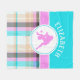Este cobertor de pelúcia de esferas de papel da garota de verão tem um fundo de tartã de cor clara. A xadrez consiste em listras de turquesa, rosa, bronzeada, brancas e pretas. Há um dentro de círculo na frente de um jogador de softball. Adicione o nome dela antes de pedir! ©gollygirl.com