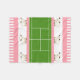 Um cobertor de bebês com tênis doce, com tema de "baby blanket", que apresenta cordeiros fofos em volta de uma quadra de tênis em fundo listrado a rosa.