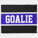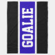 Este design desportivo apresenta letras grandes, fortes e clássicas, dentro a, a uma faixa azul vívida, com listras brancas sobre fundo preto, com "GOALIE" soletrado frente e centro. Torne-o seu: As cores e o texto neste design podem ser personalizados.