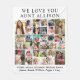 Um cobertor personalizado de colagem de fotos brancas para uma tia favorita com 30 fotos de suas sobrinhas, sobrinhos, família, animais de estimação, etc., uma ou duas linhas de texto, como "nós amamos você tia", e seus nomes em tipografia elegante.