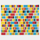 Um design composto por faixas com bandas pintadas à mão, blocos e manchas de cor em tons de vermelho, âmbar, ouro profundo, azul, cinza preto e branco. Inspirado por totens pintados.