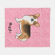 A ilustração original do desenho animado de Destei de um cão da raça Pembroke Welsh Corgi, de cor tricolor casaco, de cor vermelha, numa cor de fundo rosa, com um padrão de corações em diferentes tamanhos. Há também uma área de texto personalizável para um nome ou outro texto personalizado.
