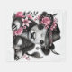 Uma linda vaca preta e branca Highland, decorada com um chapéu preto na moda, adornada com flores cor-de-rosa, apresentando charme e design artístico.