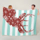 Um cobertor com veado vermelho com padrão branco de floco de neve sobre um fundo listrado azul e branco.