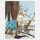 Gato da Floresta Norueguesa sentado ao lado de uma árvore com um dragão azul sentado num capacete de garrafa. Neve ao redor deles, espada e machado viking com eles.