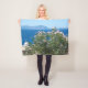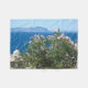 Vista aquática com flores em flecha, torre branca e vista marinha e montanhosa numa ilha grega