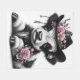 Ilustração de uma jovem vaca negra e branca, estilizada com chapéu decorado e sotaques florais, evocando temas da natureza, inocência e beleza através de sua encantadora composição e apresentação artística.