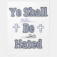 Este cobertor de velo tem um design que apresenta uma fonte impressão de Lumberjack com linhas azuis claras cinza que mostra a frase "Ye Shall Be Hated" com um estilo impressão de tipografia com cruzes em cada lado e entre a redação baseada em "Matthew 10:22 KJV" neste tema de citação da bíblia King James Version. Este cobertor é feito de um veleiro de 100% de tecido mole e confortável veloz velo de poliéster com impressão de cores vibrantes de borda a borda e costura de borda dupla com uma máquina de trás colorido esbranquiçada e lavável.