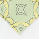 Two yellow towels with a geometric pattern hang on a wall rack in the top image. The bottom image shows a matching washcloth folded at one corner."