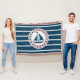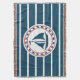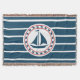 Design náutica com decoração de embarcações à vela em forma redonda, em fundo listrado a azul e a branco