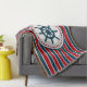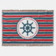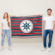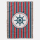 Design náutico com decoração das rodas de vela em forma redonda com estrelas sobre fundo listrado vermelho, azul e branco