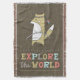 Estilo escandinavo Raposa de Boho completa com fita e arco com penas, com texto multicolorido "Explore the World" sobre burlap castanho rústico para olhar fundo