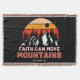 Este cobertor de arremesso tem uma fonte impressão com letras brancas/alaranjadas com contorno laranja/branco exibindo a citação bíblia "Fé pode mover montanhas" mostrando uma cordilheira cercada por árvores acima do texto com um fundo multicolorido neste tema de citação baseado em bíblia. Este cobertor é feito com 75% de algodão e 25% de poliéster com uma lavagem manual muito macia recomendada.