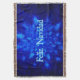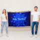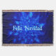 Um enxame de flocos de neve fractais azuis. O texto em espanhol, que lê "Feliz Navidad", aparece em azul e branco brilhantes.