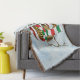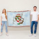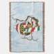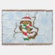 Coruja redonda, giro e giro, toda em vermelho, branco e verde. Flocos de neve caindo ao seu redor.