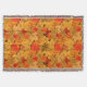 Camadas de folhas de marrom, laranja, vermelha e dourada sobre fundo marrom-chocolate.