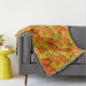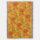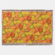Padrão de blocos sem costura de folhas estilizadas de queda em castanho, vermelho, laranja, amarelo e verde.