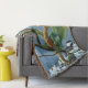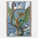 Um pequeno dragão verde numa árvore no inverno tentando fazer amigos com galinhas.