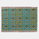 Um padrão vibrante apresenta repetidamente motivos quadrados em tons verdes, amarelos e azuis, criando um efeito caleidoscópico. O design tem uma disposição simétrica, que lembra uma aparência tecida ou semelhante a tapeçaria.