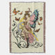 Uma fada loira Steampunk com asas rosa e azuis. A fada está vestindo roupas bonitinhas com chapéu de cima, corset e estrias, Borboletas, relógio, engrenagens e design tribal num fundo amarelo-claro