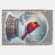 Um vibrante cardinal vermelho empoleirado dentro de uma bola de neve ornamentada, cercado por uma paisagem invernal gélida com árvores cobertas de neve e flocos de neve delicados.