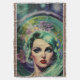 Veja este belo retrato elegante de uma mulher espacial com o universo como pano de fundo e um lindo halo verde em volta de sua cabeça adornada com flores lavandas com um olhar de lavagem com aquarela retrô. Faz um presente perfeito!