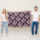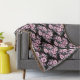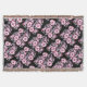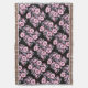 Esse gráfico floral é exibido em um padrão de diamante, com aglomerados de flores, pétalas e folhas, em mudo, de cores de; rosa, fuschia, lavanda, mauve, verde e branco contra um pano de fundo de preto.