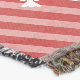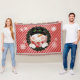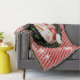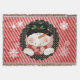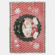 Bela jogada de Natal apresenta um bonitinho bonitinho bonitão em um chapéu preto com cachecol holly, rosa e vermelho listrado em fundo vermelho e rosa diagonal com flocos de neve brancos.