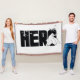 Tipografia do termo: "Herói", com o esboço de Batman no final com um enxame de morcegos.