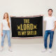 Este cobertor apresenta uma impressão antônio ousada com letras coloridas ouros mostrando a frase bíblica "O Senhor é o meu Escudo" com uma espada e um ícone de escudo em cada lado deste tema bíblico de ditado. Este cobertor é feito com 75% de algodão e 25% de poliéster com uma lavagem manual muito macia recomendada.