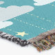 Um padrão fofo de pequenas estrelas amarelas caindo de cinzas leves e nuvens azuis fluffy. As estrelas amarelas estão ligadas a uma linha pontilhada amarela, e parecem quase como se estivessem penduradas nas nuvens. Esta cena noturna do céu é um padrão adorável para crianças.