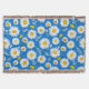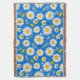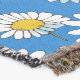 Padrão vibrante e alegre de margaridas contra um fundo azul brilhante. As margaridas são principalmente brancas, com centros amarelos ousados, e estão dispostas de forma dispersa, mas equilibrada. Além das flores, há várias folhas verdes e hastes delicadas intercaladas ao longo do desenho, adicionando um toque de natureza e frescor. A composição geral cria uma sensação viva e estival, tornando-a visualmente atraente e convidativa.