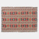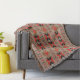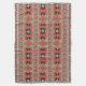 Este cobertor apresenta um padrão de malha vermelho e preto repetido em um fundo bronzeado.
