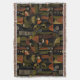 Cobertor sofisticado com padrão geométrico do meio do século, apresentando círculos, arcos, triângulos e retângulos em verde floresta, laranja queimado, ocre e creme em um fundo preto. Texturas ricas e formas retrô-modernas criam um design ousado ideal para amantes do Bauhaus, fãs de decoração vintage e qualquer pessoa atraída pelo estilo moderno sombrio.