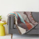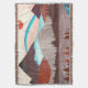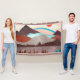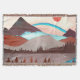 Paisagem de montanha em vermelho e azul com um lago e um arco-íris azul arrojado.