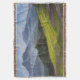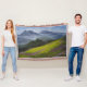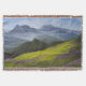 Um campo verde e luxuoso cheio de flores silvestres roxas vibrantes se estende através do primeiro plano sob um céu azul brilhante. Montanhas misteriosas sobem majestamente ao fundo, criando uma paisagem serena e tranquila.