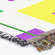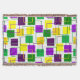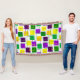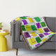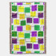 Este cobertor tem um design geométrico de quadrados em roxo, amarelo e verde espalhados com seus contornos.