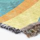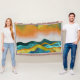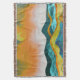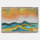 Cena de paisagem abstrato de uma zona de montanha com colinas rolantes e uma tempestade de chuva em laranja, ouro, azul e ciano.