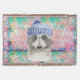 Roxy raramente fica sentado tempo suficiente para um retrato. Na maioria das noites ela pode estar pilhando as caixas de lixo no distrito de Ballard, em Seattle. Placa de aquarela digital em retrato branco azul em fundo multicolorido