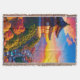 Um templo japonês situado em um morro, que fornece uma visão pitoresca da cidade e das montanhas durante o pôr do sol.
