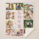 Uma colagem de fotos cor-de-rosa mantém o sherpa cobertor com 10 fotos da família e "LOVE" gravadas verticalmente no meio, em tipografia aberta.