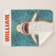 As pessoas fugirão com medo quando virem este cobertor de sherpa de Shark Branco, Excelente personalizado. Ele tem um tubarão desenhado à mão com dentes pontiagudos, nadando ao longo de um fundo oceânico verde-azul com bolhas e as silhuetas de peixes tentando escapar. Use o modelo fácil para adicionar seu nome. DICA: Você também pode "personalizar/personalizar" se quiser editar a fonte ou redimensionar o texto.
