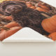 Experimente o máximo em conforto e companheirismo com nosso confortável cobertor acolhedor com um adorável Labradoodle Chocolate em meio a um campo de abóboras no pôr do sol. É o convite perfeito para se aconchegarem com seu amigo peludo e criarem as memórias do precioso juntos.