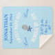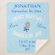 Bem-vindo ao novo menino. Personalize o Nome, a Data de Nascimento e as Estatísticas de Nascimento em texto azul contra fundo azul claro. Bocado de bebê azul prateado com Bênçãos escritas em texto branco no centro. Deixar a imagem do bebê ou personalizar carregando a sua. Clique em editar para selecionar nenhum, ajustado ou preenchimento para ajustar o tamanho da imagem. Design de arte original © TamiraZDesign.