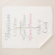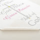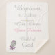 O Elegante Bebê Baptismo mantém um cobertor de tamanho médio com cruz prateada pintada à mão no centro com o aspecto de sotaques dourados. Personalize com o nome do bebê primeiro e médio em texto cor-de-rosa e Data do batismo em prata. Batismo, Deus abençoe, Criança de Deus está escrita em prata. Pequena e elegante bebê rattle está no canto inferior esquerdo do cobertor com uma estrela rosa, a aparência de um arco rosa brilhante e bonito com sombra. O amor é escrito em texto branco dentro de chocalho. Um belo cobertor de velo faria um presente especial para a menina, afilhada. NOTA: Dependendo do tamanho, você pode ajustar o tamanho do Baby Rattle clicando em personalizar e pressionando o botão e aumentar para aumentar em pequenos incrementos (se um ponto de exclamação de aviso aparecer diminuir em um incremento), e pode mover a imagem e a posição do dentro de Amor. Trabalho de arte gráfico original e Design © TamiraZDesign.