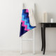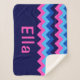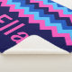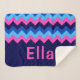 A small sized, monogrammed sherpa blanket featuring a bright, colorful pattern design of blue and pink chevrons.