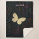 A imagem mostra um cobertor tecido com uma borboleta grande de ouro no seu centro sobre um fundo texturizado escuro com tons sutis de roxo e azul. O cobertor tem bordas franjas e inclui o texto personalizável de marcador de posição "texto" rosa ao longo do lado.